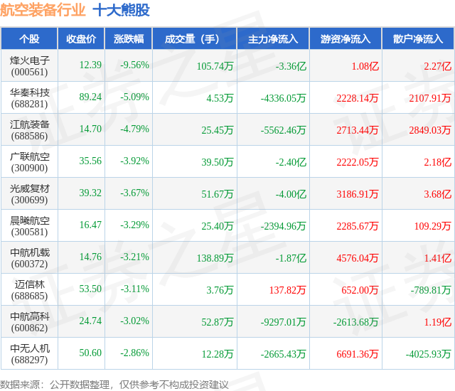 个股表现方面,航空装备行业当日领跌股为烽火电子(000561),该股当日报收12.39,下跌9.56%,成交量105.74万,主力资金净流出3.36亿元。华秦科技(688281)以下跌5.09%紧随其后,该股当日成交量4.53万,主力资金净流出4336.05万元。除此之外,江航装备(688586)、广联航空(300900)、光威复材(300699)均进入当日熊股之列。具体个股列表见下表: