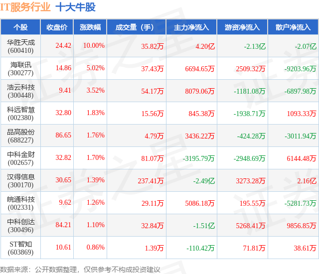 个股表现方面,IT服务行业当日领涨股为华胜天成(600410),该股当日报收24.42,上涨10.0%,成交量35.82万,主力资金净流入4.2亿元。海联讯(300277)以上涨5.02%紧随其后,该股当日成交量37.43万,主力资金净流入6694.65万元。除此之外,浩云科技(300448)、科远智慧(002380)、品高股份(688227)均进入当日牛股之列。具体个股列表见下表: