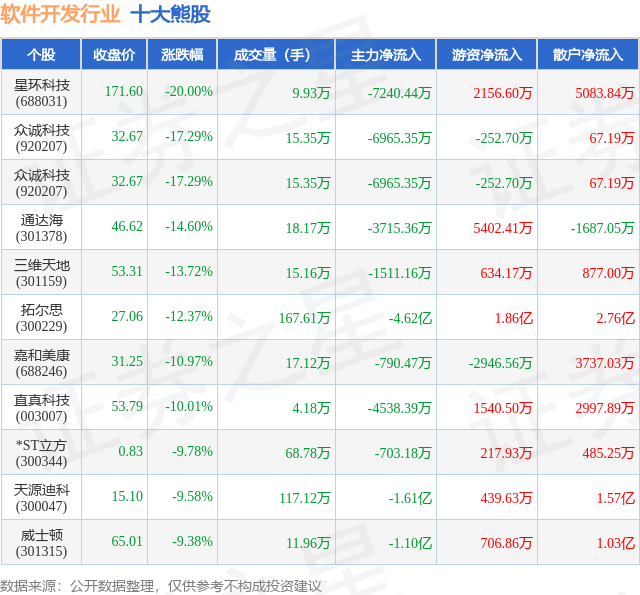 个股表现方面,软件开发行业当日领跌股为星环科技(688031),该股当日报收171.6,下跌20.0%,成交量9.93万,主力资金净流出7240.44万元。众诚科技(920207)以下跌17.29%紧随其后,该股当日成交量15.35万,主力资金净流出6965.35万元。除此之外,众诚科技(920207)、通达海(301378)、三维天地(301159)均进入当日熊股之列。具体个股列表见下表: