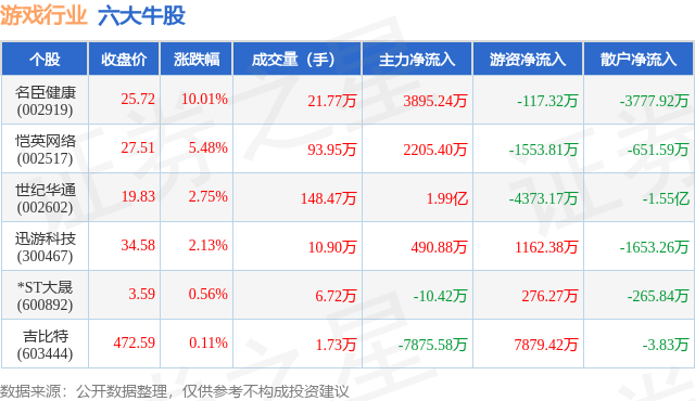 个股表现方面,游戏行业当日领涨股为名臣健康(002919),该股当日报收25.72,上涨10.01%,成交量21.77万,主力资金净流入3895.24万元。恺英网络(002517)以上涨5.48%紧随其后,该股当日成交量93.95万,主力资金净流入2205.4万元。除此之外,世纪华通(002602)、迅游科技(300467)、*ST大晟(600892)均进入当日牛股之列。具体个股列表见下表: