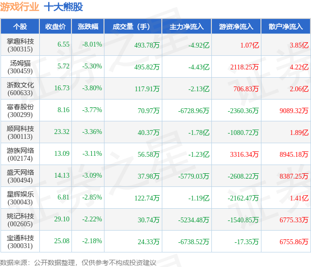 个股表现方面,游戏行业当日领跌股为掌趣科技(300315),该股当日报收6.55,下跌8.01%,成交量493.78万,主力资金净流出4.92亿元。汤姆猫(300459)以下跌5.3%紧随其后,该股当日成交量495.82万,主力资金净流出4.43亿元。除此之外,浙数文化(600633)、富春股份(300299)、顺网科技(300113)均进入当日熊股之列。具体个股列表见下表: