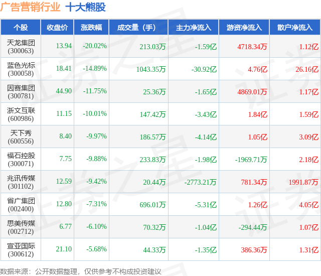 个股表现方面,广告营销行业当日领跌股为天龙集团(300063),该股当日报收13.94,下跌20.02%,成交量213.03万,主力资金净流出1.59亿元。蓝色光标(300058)以下跌14.89%紧随其后,该股当日成交量1043.35万,主力资金净流出30.92亿元。除此之外,因赛集团(300781)、浙文互联(600986)、天下秀(600556)均进入当日熊股之列。具体个股列表见下表: