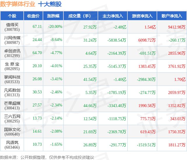 个股表现方面,数字媒体行业当日领跌股为值得买(300785),该股当日报收67.11,下跌20.0%,成交量27.92万,主力资金净流出2.48亿元。川网传媒(300987)以下跌8.64%紧随其后,该股当日成交量31.24万,主力资金净流出5838.54万元。除此之外,卓创资讯(301299)、生 意 宝(002095)、掌阅科技(603533)均进入当日熊股之列。具体个股列表见下表: