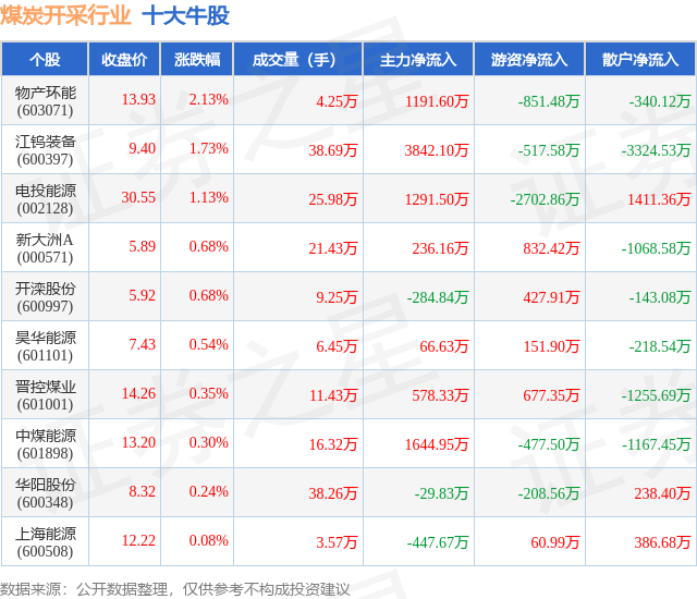 个股表现方面,煤炭开采行业当日领涨股为物产环能(603071),该股当日报收13.93,上涨2.13%,成交量4.25万,主力资金净流入1191.6万元。江钨装备(600397)以上涨1.73%紧随其后,该股当日成交量38.69万,主力资金净流入3842.1万元。除此之外,电投能源(002128)、新大洲A(000571)、开滦股份(600997)均进入当日牛股之列。具体个股列表见下表: