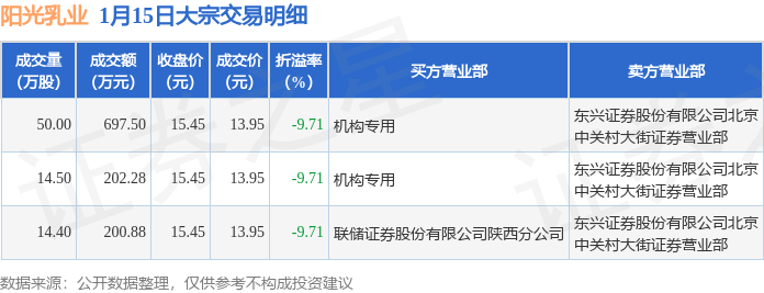 证券之星消息,1月15日阳光乳业发生大宗交易,交易数据如下:
