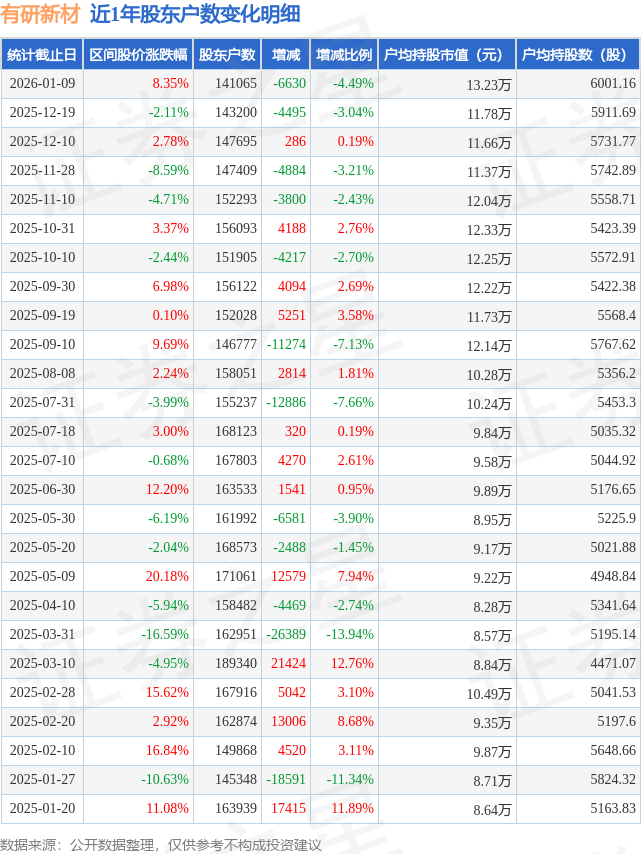 证券之星消息,近日有研新材披露,截至2026年1月9日公司股东户数为14.11万户,较12月10日减少6630.0户,减幅为4.49%。户均持股数量由上期的5912.0股增加至6001.0股,户均持股市值为13.23万元。