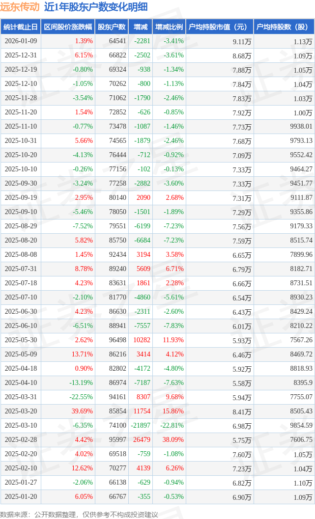 从股价来看,2025年12月31日至2026年1月9日,远东传动区间涨幅为1.39%,在此期间股东户数减少2281.0户,减幅为3.41%。