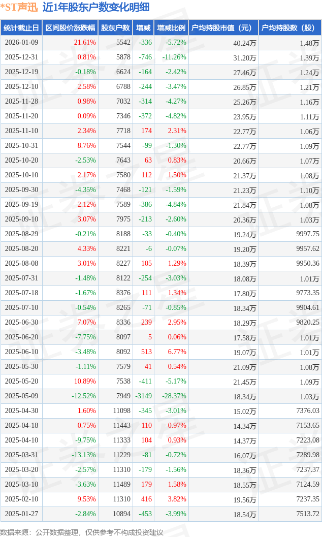 从股价来看,2025年12月31日至2026年1月9日,*ST声迅区间涨幅为21.61%,在此期间股东户数减少336.0户,减幅为5.72%。