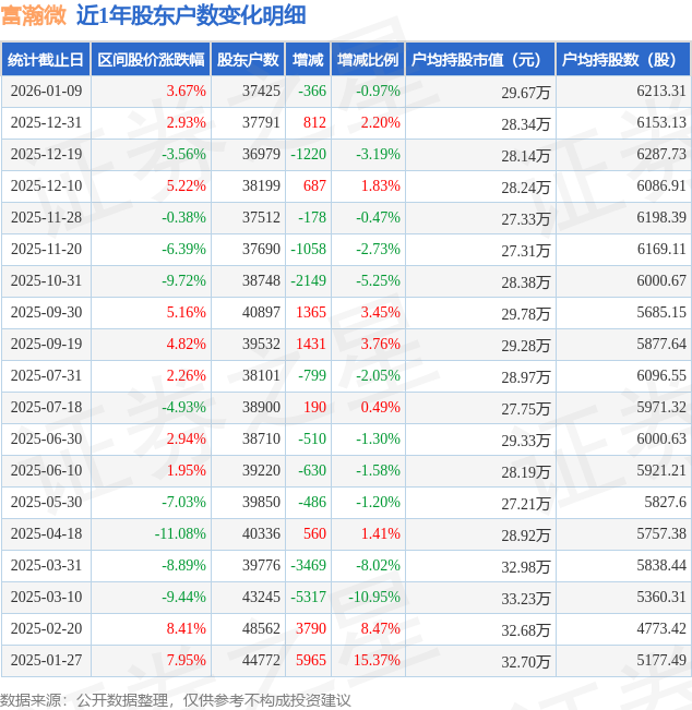 从股价来看,2025年12月31日至2026年1月9日,富瀚微区间涨幅为3.67%,在此期间股东户数减少366.0户,减幅为0.97%。