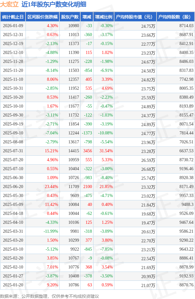 从股价来看,2025年12月31日至2026年1月9日,大宏立区间涨幅为4.3%,在此期间股东户数减少33.0户,减幅为0.3%。