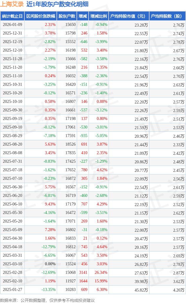 证券之星消息,近日上海艾录披露,截至2026年1月9日公司股东户数为1.56万户,较12月31日减少148.0户,减幅为0.94%。户均持股数量由上期的2.74万股增加至2.76万股,户均持股市值为23.28万元。