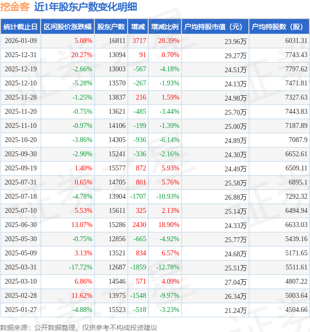 从股价来看,2025年12月31日至2026年1月9日,挖金客区间涨幅为5.08%,在此期间股东户数增加3717.0户,增幅为28.39%。