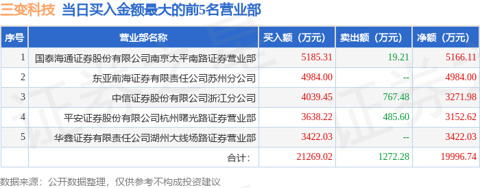 证券之星消息,沪深交易所2026年1月15日公布的交易公开信息显示,三变科技(002112)因日涨幅偏离值达到7%的前5只证券,日换手率达到20%的前5只证券登上龙虎榜。此次是近5个交易日内第2次上榜。