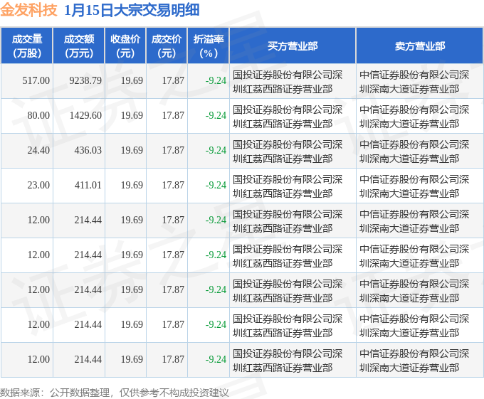 证券之星消息,1月15日金发科技发生大宗交易,交易数据如下: