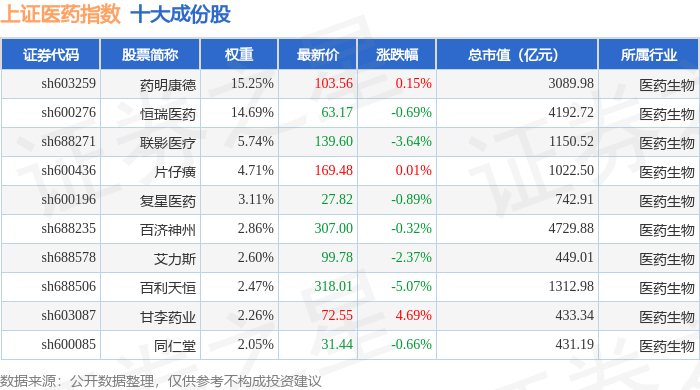 上证医药(000037)指数十大成份股详情如下: