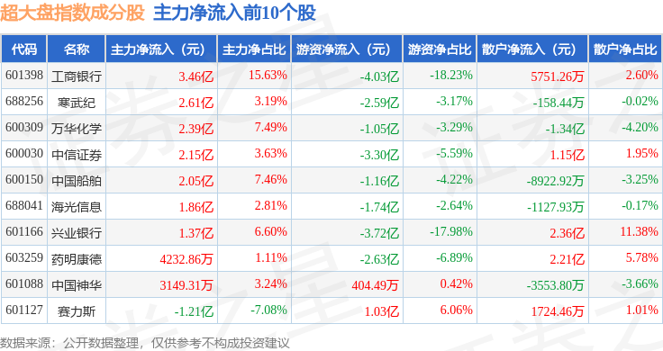 资金流向方面,超大盘(000043)指数成份股当日主力资金净流出合计19.93亿元,游资资金净流出合计21.93亿元,散户资金净流入合计41.86亿元。成份股资金流向详情见下表: