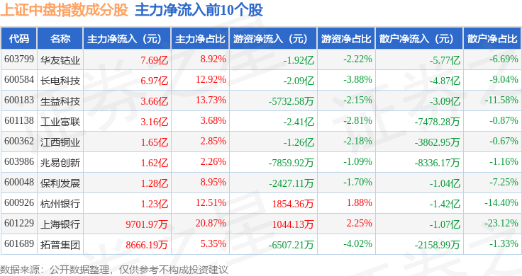资金流向方面,上证中盘(000044)指数成份股当日主力资金净流出合计20.52亿元,游资资金净流入合计27.56亿元,散户资金净流出合计7.04亿元。成份股资金流向详情见下表: