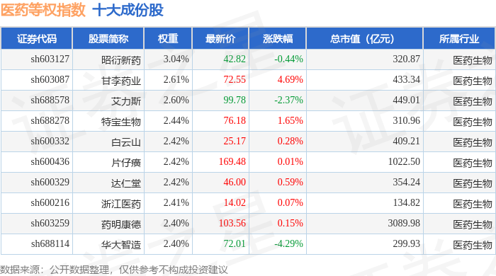 医药等权(000075)指数十大成份股详情如下: