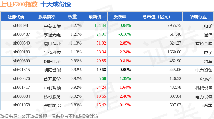 上证F300(000099)指数十大成份股详情如下:
