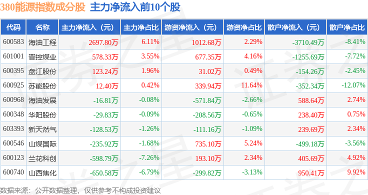 资金流向方面,380能源(000104)指数成份股当日主力资金净流出合计1.86亿元,游资资金净流入合计7927.34万元,散户资金净流入合计1.07亿元。成份股资金流向详情见下表: