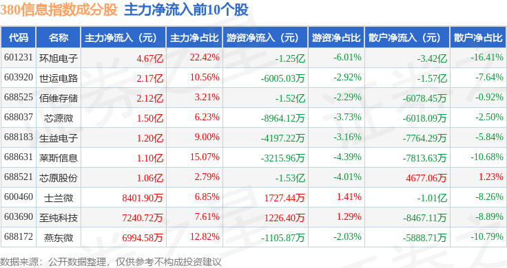 资金流向方面,380信息(000111)指数成份股当日主力资金净流入合计1218.96万元,游资资金净流出合计2.37亿元,散户资金净流入合计2.25亿元。成份股资金流向详情见下表: