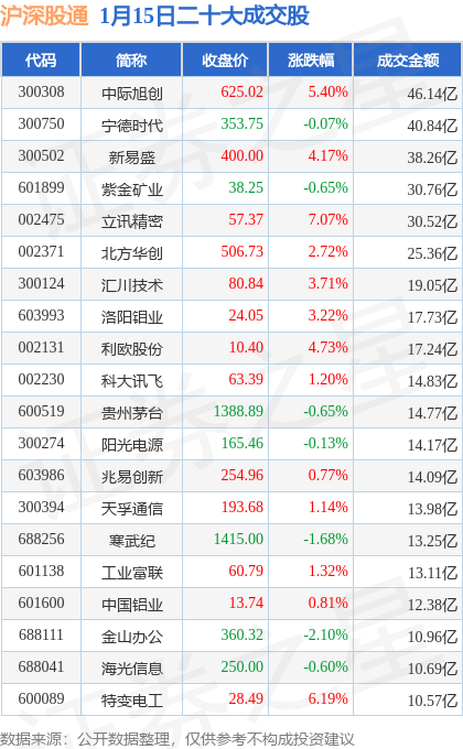 当日北向资金余额额度充足,紫光国微(002049)领涨,涨幅10.0%,交易所公布的沪深股通二十大成交股中成交额前三的为中际旭创、宁德时代、新易盛,成交额分别为46.14亿元、40.84亿元、38.26亿元。详情可见下表: