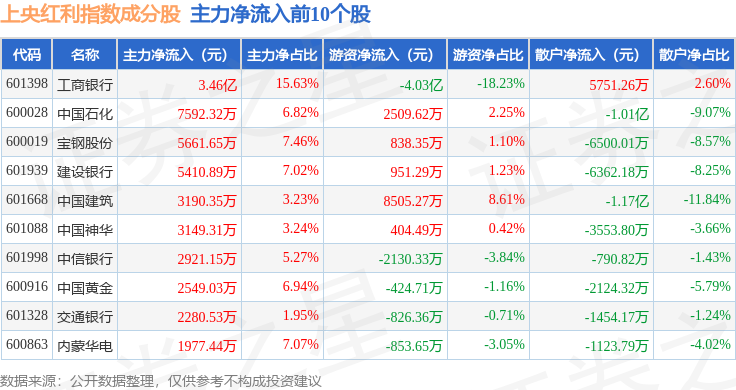 资金流向方面,上央红利(000152)指数成份股当日主力资金净流出合计12.33亿元,游资资金净流入合计6.02亿元,散户资金净流入合计6.31亿元。成份股资金流向详情见下表:
