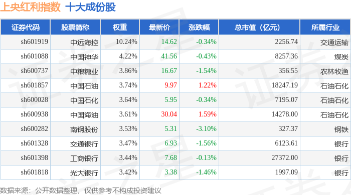 上央红利(000152)指数十大成份股详情如下: