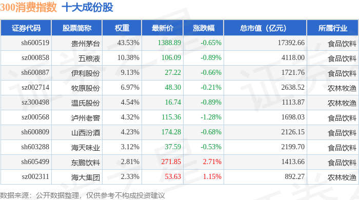 300消费(000912)指数十大成份股详情如下: