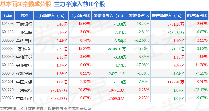 资金流向方面,基本面50(000925)指数成份股当日主力资金净流出合计17.82亿元,游资资金净流出合计4.78亿元,散户资金净流入合计22.6亿元。成份股资金流向详情见下表: