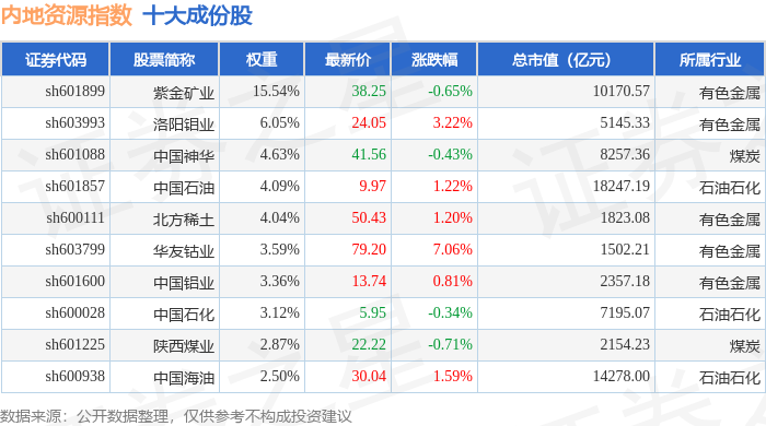 内地资源(000944)指数十大成份股详情如下: