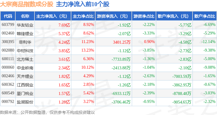 资金流向方面,大宗商品(000979)指数成份股当日主力资金净流入合计17.6亿元,游资资金净流出合计7.74亿元,散户资金净流出合计9.86亿元。成份股资金流向详情见下表: