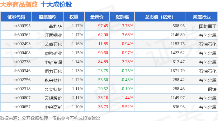 证券之星消息,1月15日,大宗商品(000979)指数报收于7361.53点,涨0.85%,成交1789.22亿元,换手率1.34%。当日该指数成份股中,上涨的有62家,华友钴业以7.06%的涨幅领涨,下跌的有32家,东阳光以6.76%的跌幅领跌。