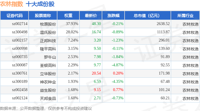 农林指数(399231)十大成份股详情如下: