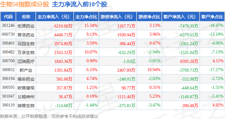 资金流向方面,生物50(399280)指数成份股当日主力资金净流出合计18.09亿元,游资资金净流入合计4.01亿元,散户资金净流入合计14.08亿元。成份股资金流向详情见下表: