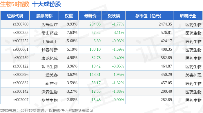 生物50(399280)指数十大成份股详情如下: