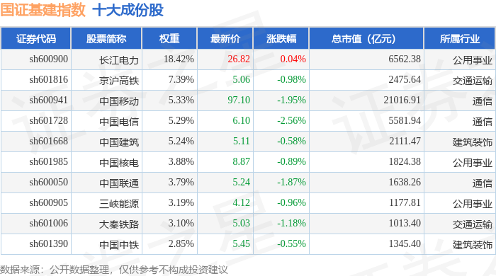 证券之星消息,1月15日,国证基建(399359)指数报收于2609.91点,跌0.66%,成交302.38亿元,换手率0.54%。当日该指数成份股中,上涨的有13家,陕西能源以2.1%的涨幅领涨,下跌的有32家,锐捷网络以3.58%的跌幅领跌。