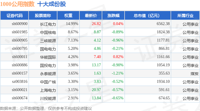 证券之星消息,1月15日,1000公用(399390)指数报收于2647.28点,跌0.3%,成交203.76亿元,换手率0.89%。当日该指数成份股中,上涨的有18家,陕西能源以2.1%的涨幅领涨,下跌的有22家,九丰能源以5.37%的跌幅领跌。