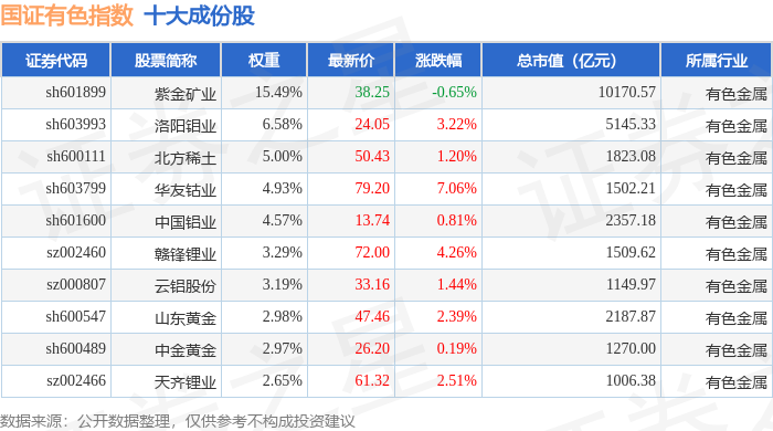 证券之星消息,1月15日,国证有色(399395)指数报收于11070.63点,涨1.61%,成交1402.02亿元,换手率3.46%。当日该指数成份股中,上涨的有44家,华友钴业以7.06%的涨幅领涨,下跌的有5家,东阳光以6.76%的跌幅领跌。