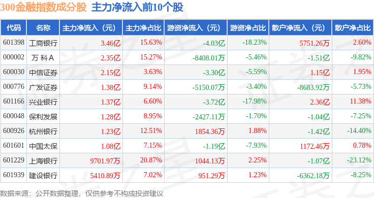 资金流向方面,300金融(399914)指数成份股当日主力资金净流出合计27.81亿元,游资资金净流入合计4.64亿元,散户资金净流入合计23.17亿元。成份股资金流向详情见下表: