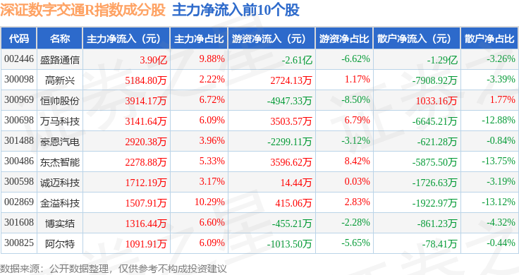 资金流向方面,深证数字交通R(470049)指数成份股当日主力资金净流出合计23.51亿元,游资资金净流出合计1.29亿元,散户资金净流入合计24.8亿元。成份股资金流向详情见下表: