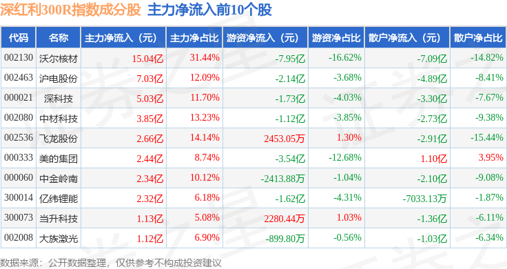 资金流向方面,深红利300R(470062)指数成份股当日主力资金净流出合计46.2亿元,游资资金净流出合计10.17亿元,散户资金净流入合计56.38亿元。成份股资金流向详情见下表: