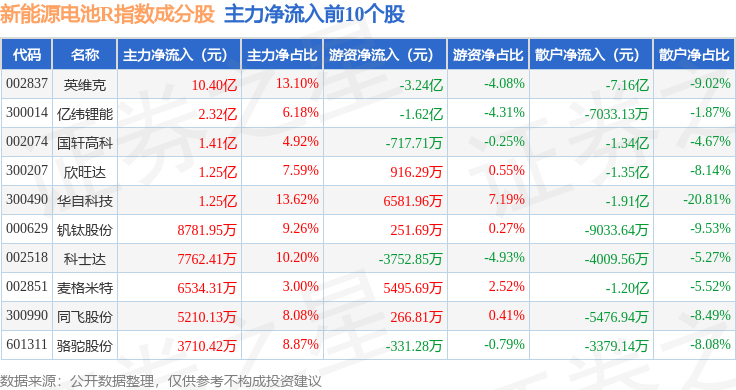 资金流向方面,新能源电池R(480027)指数成份股当日主力资金净流入合计9.42亿元,游资资金净流出合计1.04亿元,散户资金净流出合计8.38亿元。成份股资金流向详情见下表: