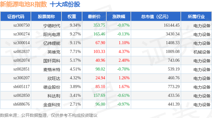 新能源电池R(480027)指数十大成份股详情如下: