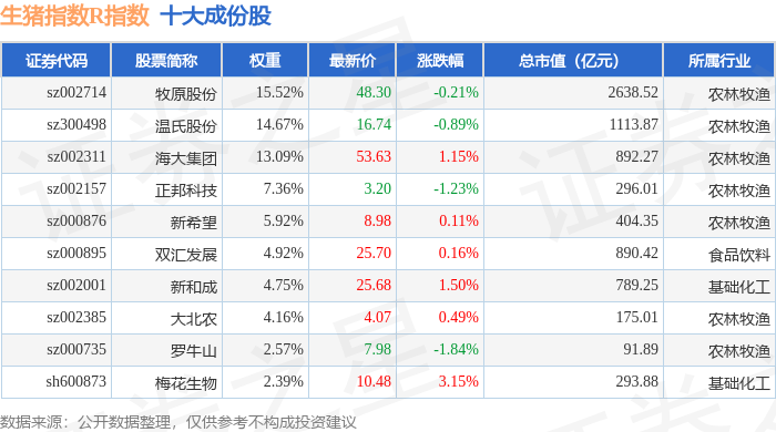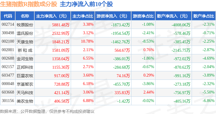 资金流向方面,生猪指数R(480073)指数成份股当日主力资金净流出合计1.08亿元,游资资金净流入合计1689.36万元,散户资金净流入合计9137.81万元。成份股资金流向详情见下表: