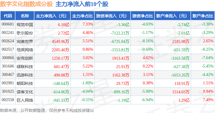 资金流向方面,数字文化(970047)指数成份股当日主力资金净流出合计43.8亿元,游资资金净流入合计2.25亿元,散户资金净流入合计41.54亿元。成份股资金流向详情见下表: