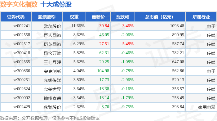 数字文化(970047)指数十大成份股详情如下: