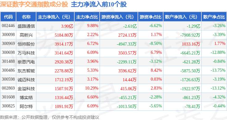资金流向方面,深证数字交通(970049)指数成份股当日主力资金净流出合计23.51亿元,游资资金净流出合计1.29亿元,散户资金净流入合计24.8亿元。成份股资金流向详情见下表: