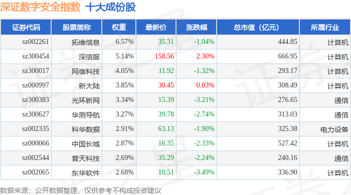 证券之星消息,1月15日,深证数字安全(970052)指数报收于3808.67点,跌3.24%,成交641.71亿元,换手率7.44%。当日该指数成份股中,上涨的有4家,深信服以2.3%的涨幅领涨,下跌的有46家,易华录以19.98%的跌幅领跌。