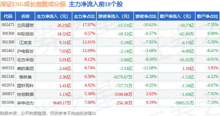 资金流向方面,深证ESG成长(970060)指数成份股当日主力资金净流入合计45.29亿元,游资资金净流出合计50.08亿元,散户资金净流入合计4.79亿元。成份股资金流向详情见下表: